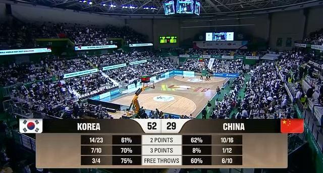 上一场大杀四方的李贤重,开场在给其他人掩护,给其他人制造机会,培养队友的手感和信心。韩国队半场打完三分10中7,投出了61%的投篮命中率。我们的三分命中率是12中1,就程帅澎进了一个。